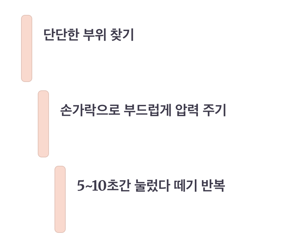 손가락 끝을 이용해 이 단단한 부위를 지그시 눌러주세요. 아플 정도로 강하게 누르는 것이 아니라, 부드러운 압력으로 5~10초간 눌렀다가 떼기를 반복합니다. 작은 원을 그리듯 마사지해 주는 것도 좋습니다. 이 자극은 굳어있는 변을 부드럽게 만들어주고, 장의 신경을 직접 자극하여 배변 신호를 유도하는 데 큰 도움이 됩니다.