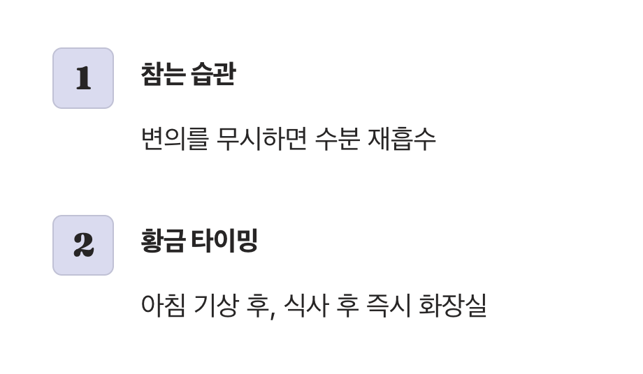 학교나 회사에서, 혹은 밖에서 화장실 가기가 불편해서 변의가 느껴져도 꾹 참은 경험이 다들 있으실 겁니다. 하지만 변이 마려운 느낌, 즉 '신호'가 왔을 때 바로 가지 않고 참게 되면 대장은 "아, 아직 내보내면 안 되는구나"라고 착각하고 변을 계속 품고 있습니다. 이렇게 머무르는 시간이 길어질수록 수분은 계속 재흡수되고 변은 점점 더 단단하게 굳어집니다.
