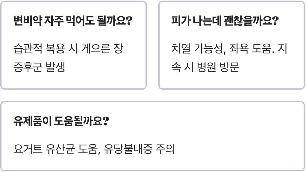 A. 당장은 효과가 빠르겠지만, 습관적으로 약에 의존하면 나중에는 장이 스스로 운동하는 법을 잊어버리게 됩니다. 약 없이는 배변할 수 없는 '게으른 장 증후군'이 생길 수 있으니, 정말 심할 때만 전문가와 상의 후 사용하시고 생활 습관 개선을 우선으로 해야 합니다.