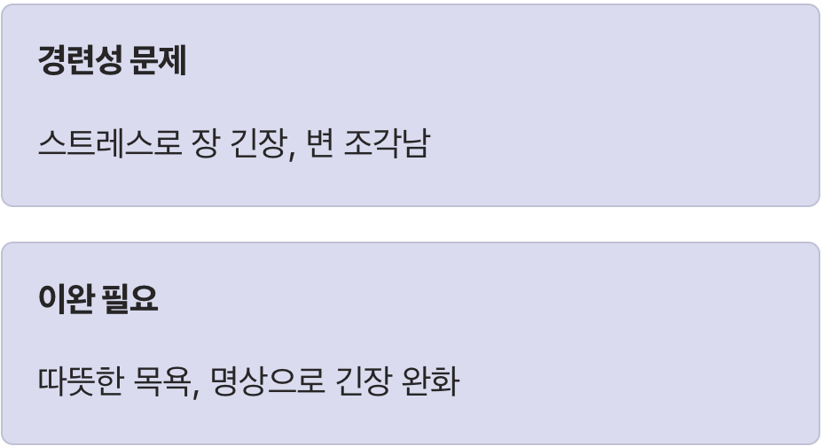 이럴 때는 식이섬유를 너무 많이 먹으면 오히려 자극이 되어 배가 더 아플 수 있습니다. 우선은 마음을 편안하게 먹고 휴식을 취하는 것이 최고의 치료제입니다. 따뜻한 물에 목욕하며 몸의 긴장을 풀거나, 명상을 통해 스트레스를 관리해 보세요. 장이 긴장을 풀고 부드럽게 이완되어야 비로소 갇혀 있던 변들이 합쳐져 부드럽게 배출될 수 있습니다.