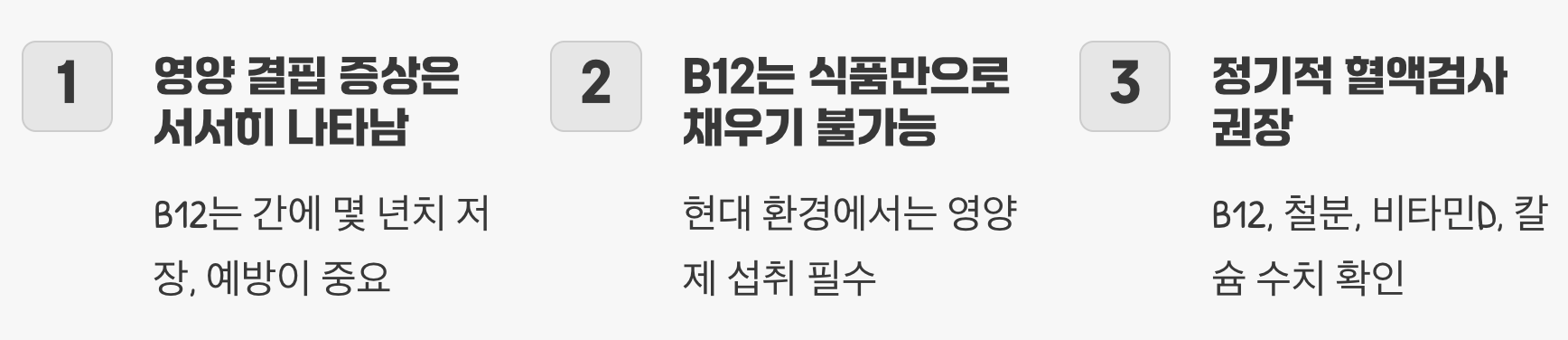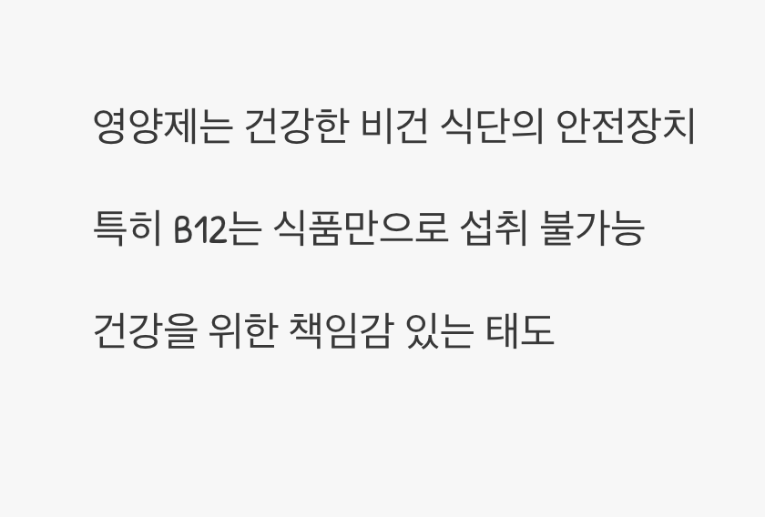 특히 비타민 B12처럼 식품만으로 섭취가 거의 불가능한 영양소의 경우, 영양제는 당신의 건강을 지켜줄 가장 확실한 안전장치입니다. 건강을 위해 시작한 채식이, 오히려 건강을 해치는 일이 되어서는 안 되니까요.