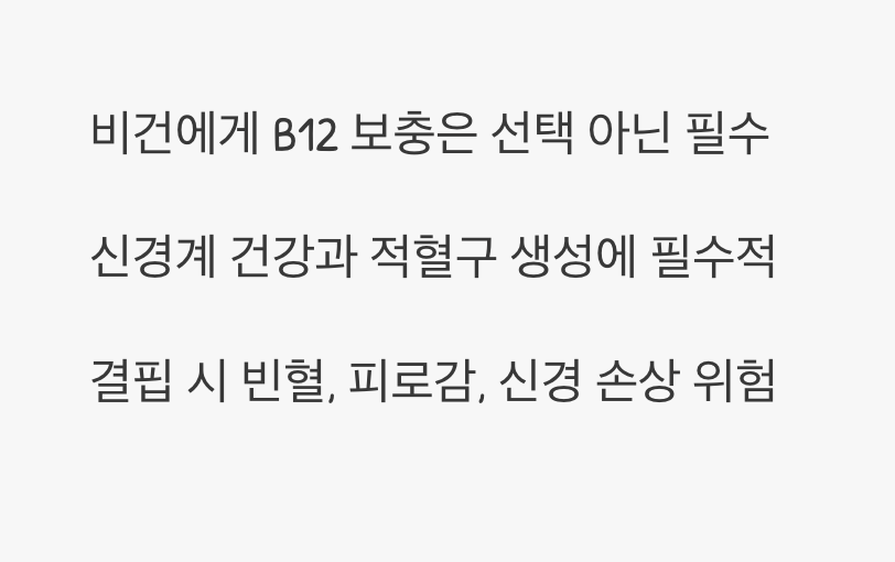 만약 당신이 비건 식단을 하면서 단 하나의 영양제만 먹어야 한다면, 그것은 단연코 ‘비타민 B12’입니다. 비타민 B12는 신경계를 건강하게 유지하고, 적혈구를 만드는 데 필수적인 역할을 하지만, 안타깝게도 이 영양소는 식물성 식품에서는 거의 발견되지 않습니다. 오직 동물성 식품이나 특정 미생물을 통해서만 얻을 수 있죠.