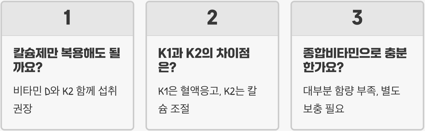 비타민 D3는 칼슘 농도를 조절하고, 비타민 K2는 그 칼슘이 뼈에 잘 고정되도록 해주기 때문에 둘의 상호 작용이 뼈 건강 유지에 필수임을 설명합니다.