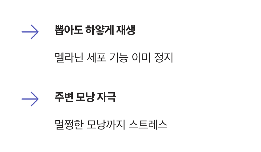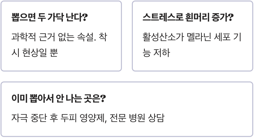 많은 분이 오해하는 것 중 하나가 흰머리를 뽑으면 그 자리에 검은 머리가 다시 날 것이라는 기대감입니다. 하지만 안타깝게도 한번 하얗게 변한 모낭에서는 멜라닌 색소를 생성하는 세포가 이미 기능을 멈춘 상태입니다. 즉, 뽑아봤자 그 자리에는 다시 하얀 머리카락이 올라올 뿐입니다.