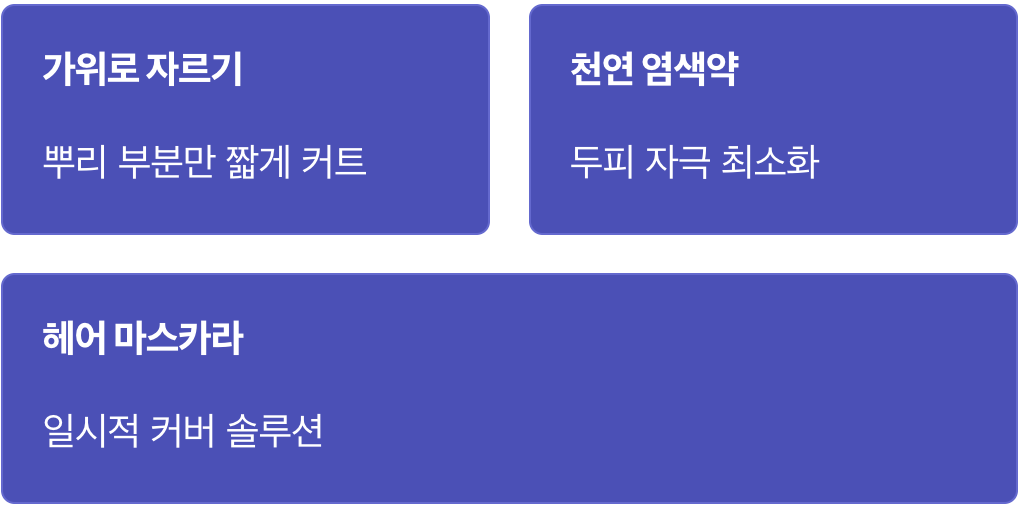 그렇다면 보기 싫은 이 하얀 불청객을 어떻게 처리해야 할까요? 가장 안전하고 추천하는 방법은 뿌리 부분만 짧게 잘라내는 것입니다. 두피에 아무런 자극을 주지 않으면서 시각적인 스트레스를 해소할 수 있는 가장 현명한 대안입니다.