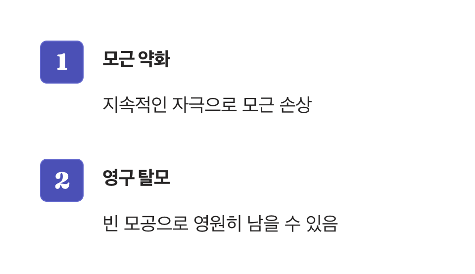 우리 머리카락은 '모낭'이라는 주머니에서 자라납니다. 이 모낭은 평생 동안 만들어낼 수 있는 머리카락의 개수가 정해져 있습니다. 보통 한 개의 모낭에서 25개에서 35개 정도의 머리카락이 나고 빠지기를 반복하는데, 인위적으로 힘을 가해 머리카락을 뽑게 되면 이 모낭의 수명이 급격히 줄어들게 됩니다.