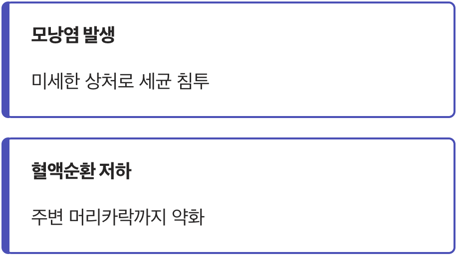 머리카락을 강제로 뽑아낸 자리는 피부가 뜯겨 나간 것과 같은 상태가 됩니다. 이 미세한 상처 틈으로 세균이 침투하면 '모낭염'이라는 염증이 발생하게 됩니다. 두피가 붉어지고 뾰루지가 생기며, 심한 경우에는 고름이 차오르기도 하는데 이는 두피 건강을 심각하게 해치는 원인이 됩니다.
