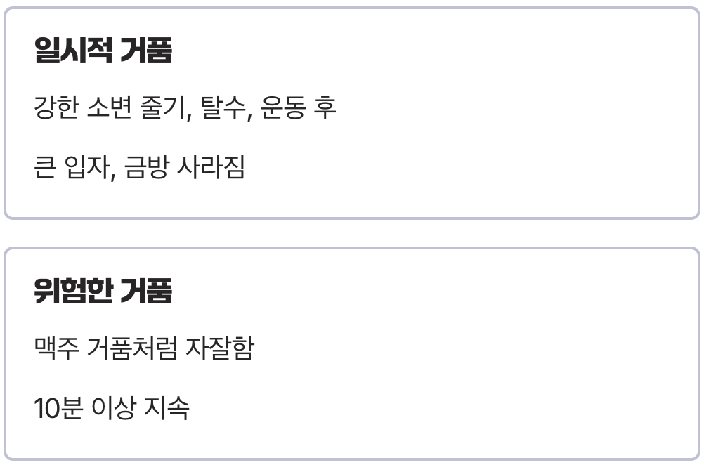 거품뇨 외에도 부종, 체중 증가, 혈압 상승 등 동반 증상을 체크해야 한다고 안내합니다.