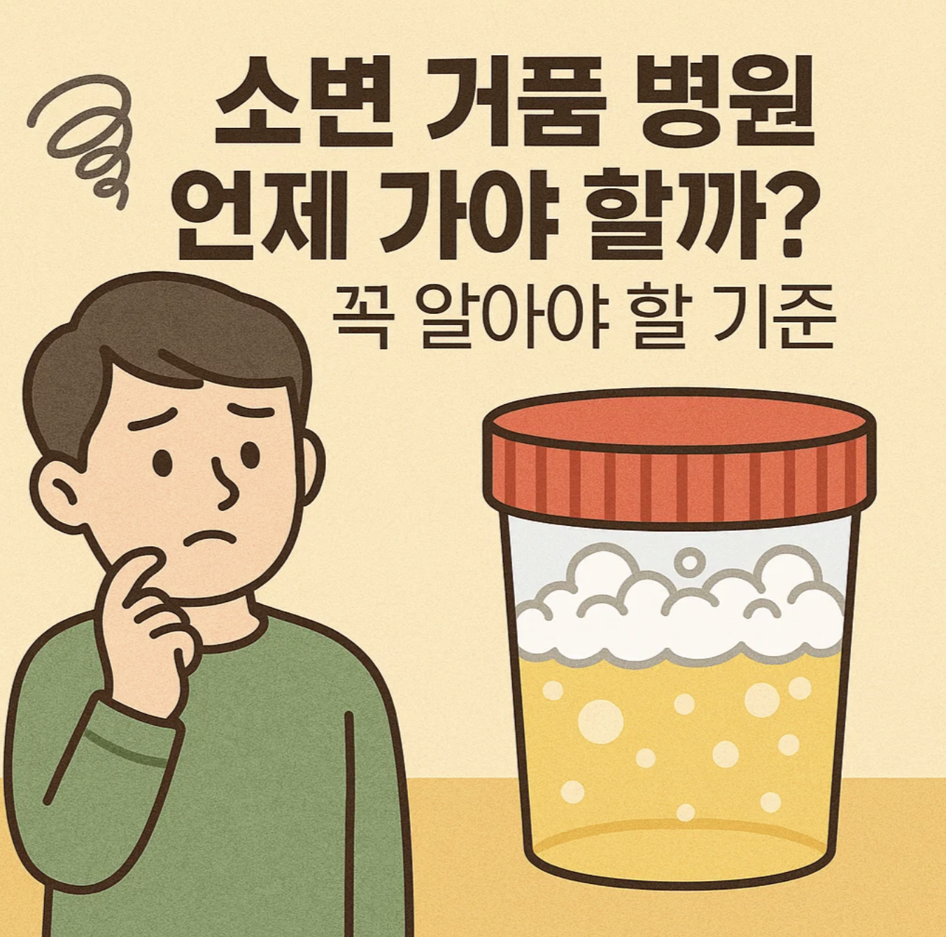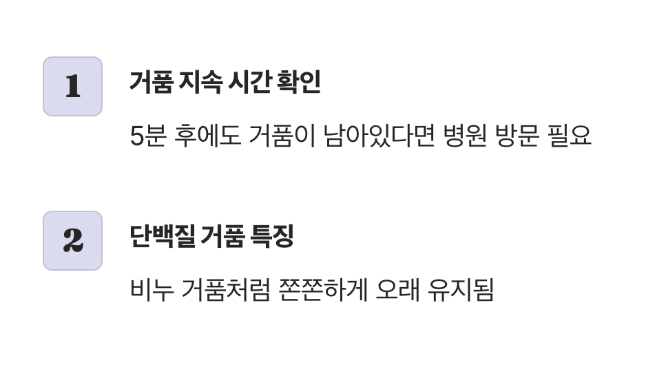 1분 이상 끈적한 거품 매일 나오거나 부종·고혈압 동반 시 병원 검사 필요하다고 기준 제시합니다.