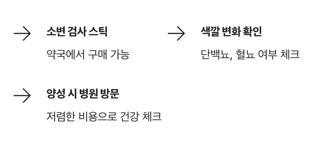 병원 가기가 망설여진다면 약국에서 파는 '소변 검사 스틱(스트립)'을 이용해 보세요. 리트머스 종이처럼 생긴 스틱에 소변을 묻히면 색깔이 변하는데, 이를 통해 단백뇨가 있는지, 피가 섞여 나오는지 대략적으로 알 수 있습니다.