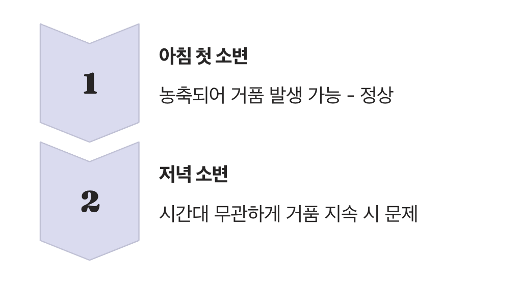 두 번째 기준은 '발생 시점'입니다. 자고 일어난 아침 첫 소변은 밤사이 수분 섭취가 없어 농축되기 때문에 정상인이라도 거품이 생길 수 있습니다. 이것은 병이 아니라 자연스러운 생리 현상일 가능성이 큽니다.