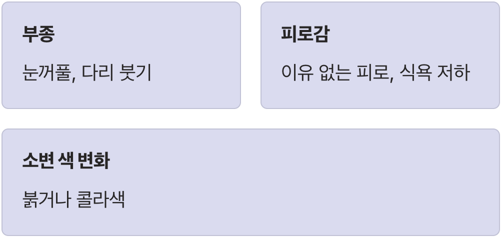 부종·소변색 변화·소변량 감소·구토 동반 시 즉시 병원 방문하며 손발얼굴 붓기부터 확인하라고 합니다. - 소변에 거품이 많아요, 콩팥이 안 좋은 걸까요?