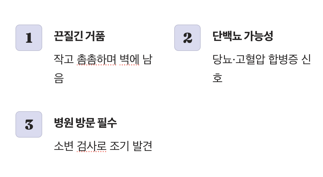 일시적 거품과 단백뇨를 구분하는 법, 소변검사 필요 시점, 생활습관 교정과 약물치료 방향을 정리합니다.