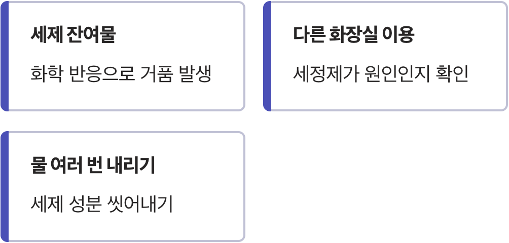 이게 내 몸 때문인지 세제 때문인지 헷갈린다면 확인해 보는 방법이 있습니다. 공중화장실이나 다른 층의 화장실을 이용해 보는 것입니다. 다른 곳에서는 괜찮은데 우리 집 변기에서만 그렇다면 범인은 세정제입니다. 또는 물을 여러 번 내려 세제 성분을 씻어낸 뒤 다시 확인해 보면 불필요한 걱정을 덜 수 있습니다.