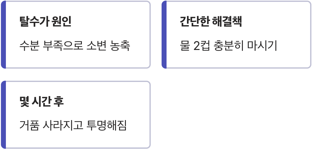 이때의 해결책은 아주 간단합니다. 걱정할 시간에 시원한 생수를 두 컵 정도 충분히 마셔주는 것입니다. 몸에 수분이 보충되면 콩팥은 다시 맑고 깨끗한 소변을 만들어냅니다. 물을 마시고 나서 몇 시간 뒤 다시 화장실을 갔을 때 거품이 사라지고 색깔이 투명해졌다면, 그것은 단순한 탈수 증상이었으니 안심하셔도 됩니다.