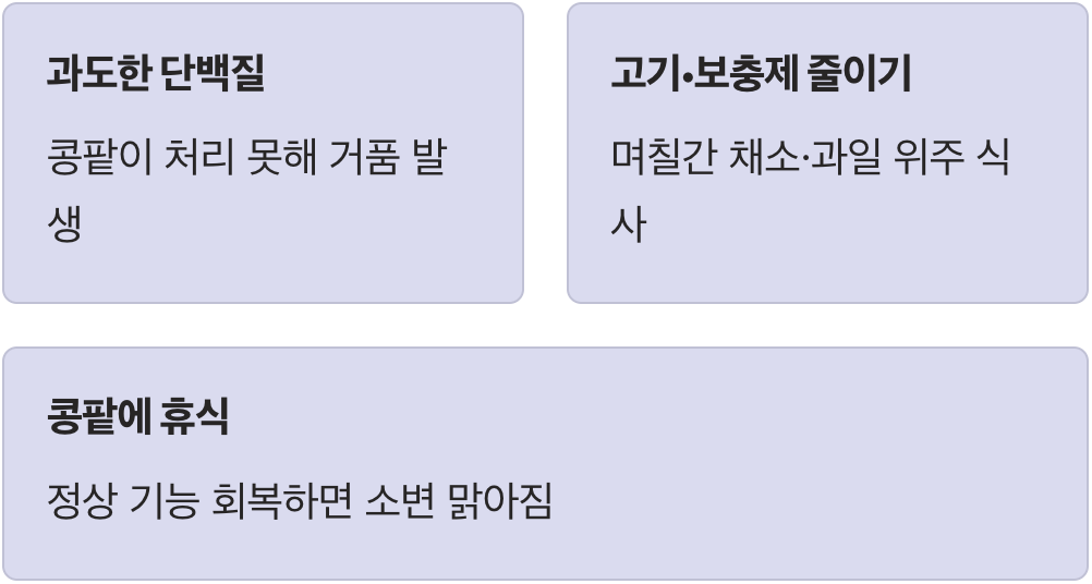 이런 경우에는 식단을 조절하는 것이 정답입니다. 며칠 동안만이라도 고기나 보충제 섭취를 줄이고, 채소와 과일 위주의 식사를 해보세요. 콩팥에게 쉴 시간을 주는 것입니다. 과도한 업무에서 해방된 콩팥이 다시 정상적으로 기능을 회복하면 소변은 자연스럽게 맑아집니다.