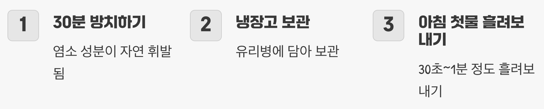 가장 좋은 해결책은 수돗물을 받은 뒤 뚜껑을 열어 30분 정도만 놓아두거나, 유리병에 담아 냉장고에 보관하는 것입니다. 염소는 휘발성이 매우 강해 공기 중으로 금방 날아가 냄새가 사라집니다. 또한, 아침에 일어나서 처음 사용하는 물은 밤사이 수도관에 고여 있던 물일 수 있으니, 30초에서 1분 정도 그냥 흘려보낸 뒤 사용하는 것이 더욱 안전하고 좋습니다.