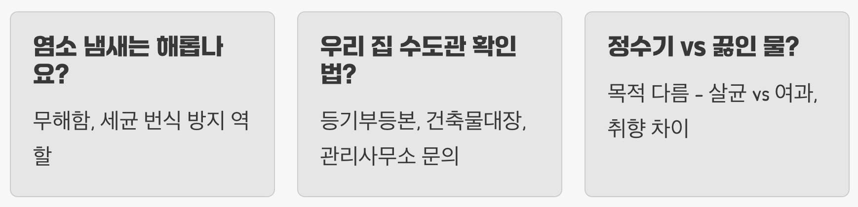 인터넷 ‘물사랑 누리집(ilovewater.or.kr)’ 사이트나 지역 상수도사업본부를 통해 간단하게 신청만 하면, 담당 직원이 직접 가정을 방문하여 탁도, 잔류염소, 철, 구리 등 주요 항목을 검사하고 그 결과를 바로 알려줍니다. 이 검사를 통해 ‘적합’ 판정을 받았다면, 적어도 우리 집 배관 상태는 크게 걱정하지 않아도 된다는 가장 확실한 증거를 얻는 셈입니다.