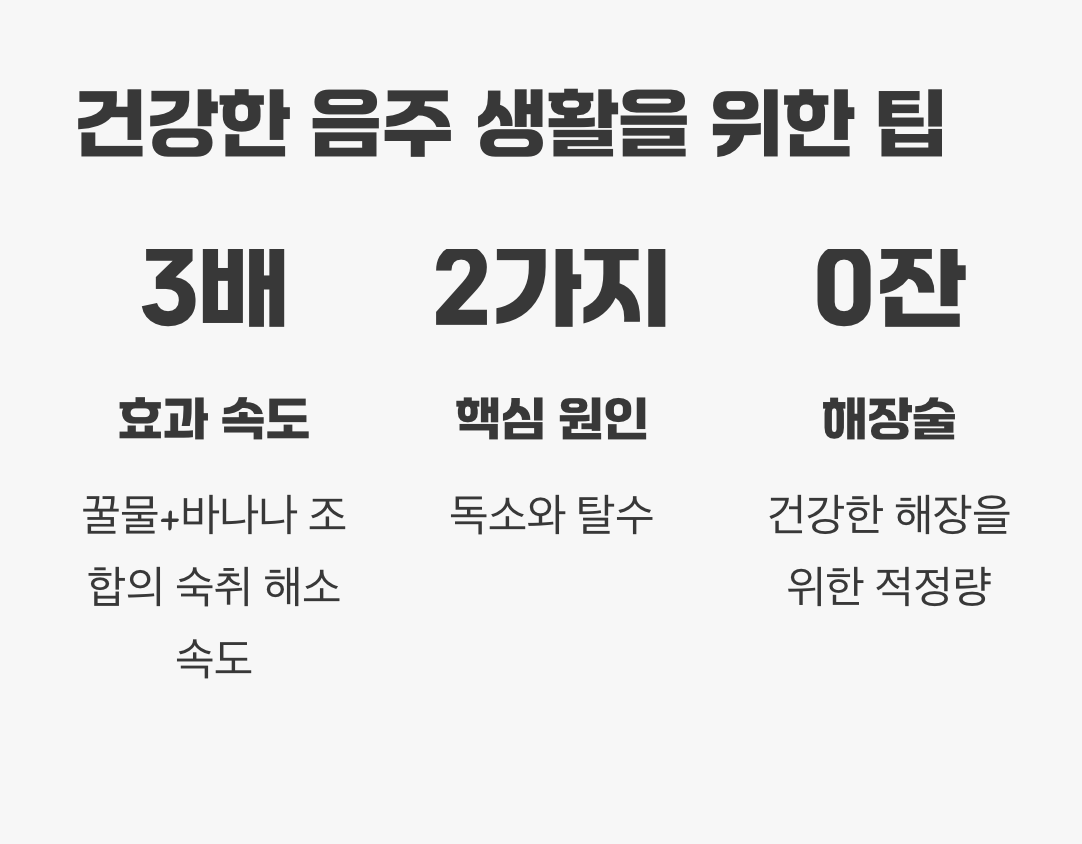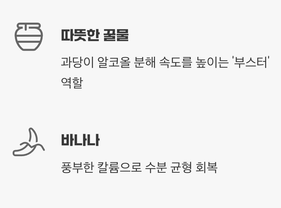 또한, 바나나에는 알코올 때문에 빠져나간 핵심 전해질인 ‘칼륨’이 매우 풍부하게 들어있습니다. 즉, 꿀물로 해독 속도를 높이고, 바나나로 수분 균형을 되찾아주는 완벽한 협력 작전인 셈이죠. 이 두 가지 조합은 위에도 부담을 주지 않아, 빈속에 섭취하기에도 가장 이상적인 첫 번째 해장 음식입니다.