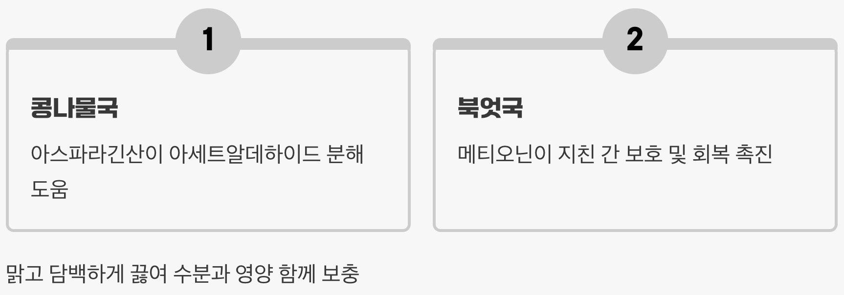 콩나물 뿌리에 풍부한 ‘아스파라긴산’은 아세트알데하이드 분해를 돕는 최고의 성분이며, 북어에 풍부한 ‘메티오닌’과 같은 아미노산은 지친 간을 보호하고 회복을 촉진합니다. 맵고 짜게 끓이기보다는, 맑고 담백하게 끓여 수분과 영양을 함께 보충해 주는 것이 포인트입니다.