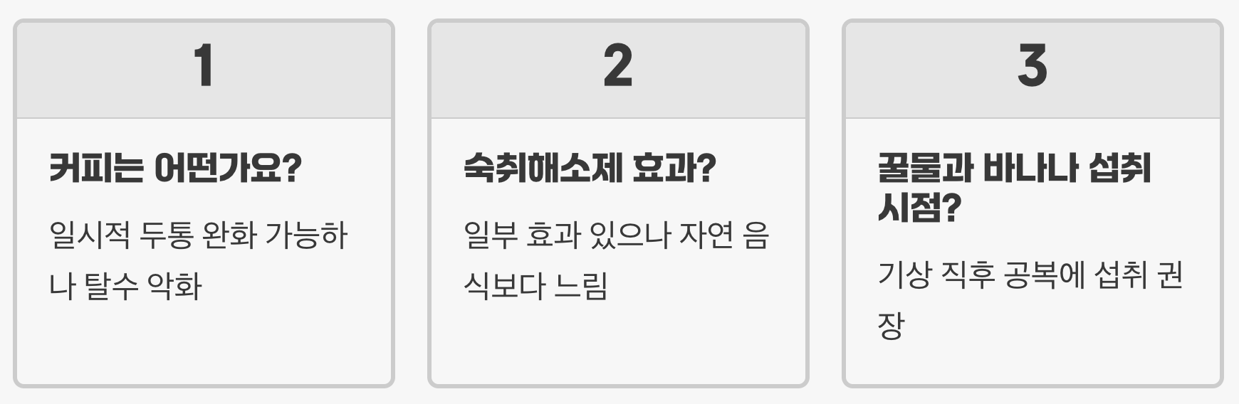 A. 효과가 전혀 없는 것은 아닙니다. 시중에 판매되는 대부분의 숙취해소제에는 알코올 분해를 돕는 성분들이 들어있습니다. 하지만 가장 중요한 수분과 전해질, 그리고 각종 비타민을 직접 보충해 주는 자연 음식만큼 빠르고 근본적인 해결책이 되기는 어렵습니다.