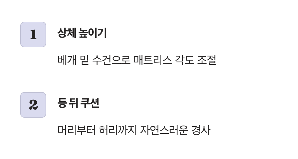 누워 있으면 중력 때문에 콧물이 목뒤로 넘어가거나 코가 더 꽉 막히게 됩니다. 어른도 코가 막히면 앉아있는 게 편하듯이 아이들도 마찬가지입니다. 잘 때 아이의 상체를 평소보다 약간 높게 만들어주면 숨쉬기가 훨씬 수월해집니다. 베개 밑에 수건을 도톰하게 깔아서 매트리스 자체의 각도를 살짝 높여주거나, 등 뒤에 쿠션을 받쳐주는 것이 좋은 해결책입니다.