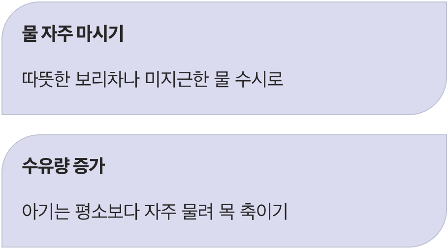 콧물이 뒤로 넘어가면 가래가 되고, 이것이 기침을 유발하여 아이를 토하게 만들기도 합니다. 몸속에 수분이 부족하면 콧물과 가래가 풀처럼 끈적해져서 배출이 어려워집니다. 평소보다 물을 자주, 많이 마시게 하는 것이 중요합니다. 아직 물을 못 마시는 아기라면 평소보다 수유량을 조금 늘리거나 자주 물려서 목을 축여주세요.