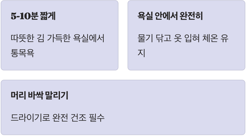 단, 목욕 후가 중요합니다. 물기가 마르면서 체온이 급격히 떨어질 수 있으니 욕실 안에서 물기를 완전히 닦고 옷까지 입혀서 나와야 합니다. 머리카락도 드라이기로 바싹 말려주세요. 개운하게 씻고 나면 아이의 긴장이 풀려서 깊은 잠을 자게 되고, 이는 컨디션 회복에 아주 큰 도움이 됩니다.