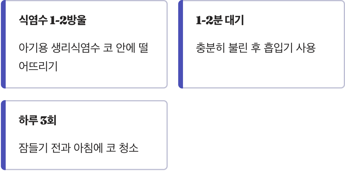 식염수를 넣고 바로 뽑아내지 말고 1분에서 2분 정도 기다려주는 것이 요령입니다. 충분히 불린 뒤에 콧물 흡입기를 사용하면 시원하게 이물질이 빠져나오고, 때로는 재채기를 하면서 자연스럽게 덩어리가 튀어나오기도 합니다. 하루에 3번 정도, 특히 잠들기 전과 아침에 일어났을 때 식염수로 코 청소를 해주면 아이가 훨씬 편안하게 잠들 수 있습니다.