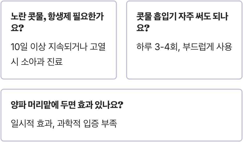 A. 민간요법으로 양파를 썰어서 두는 경우가 있는데, 양파의 매운 성분인 알리신이 일시적으로 코를 뚫어주는 효과가 있을 수 있습니다. 하지만 냄새가 독해서 아이가 잠을 설칠 수도 있고, 과학적으로 완벽하게 입증된 치료법은 아니니 보조적인 수단으로만 생각하시는 게 좋습니다.