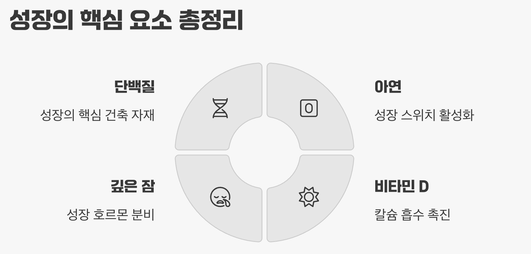 많은 부모님들이 칼슘 섭취에만 집중한 나머지, 정작 이 중요한 일꾼들을 놓치고 있습니다. 아무리 좋은 재료를 공급해도, 성장 시스템 자체가 활발하게 돌아가지 않으면 밑 빠진 독에 물 붓기나 다름없습니다. 따라서 진짜 해결책은 칼슘이라는 재료와 함께, 성장의 엔진을 돌릴 다른 영양소들을 골고루 챙기는 것입니다.
