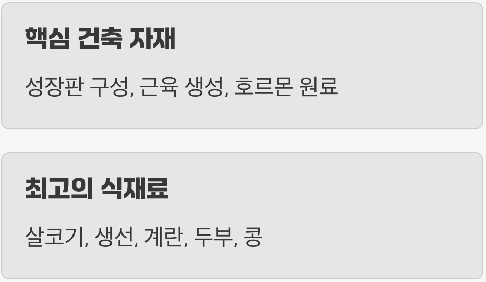 성장기에 가장 중요한 영양소, 바로 '단백질'입니다. 단백질은 뼈의 성장을 주관하는 성장판을 구성하고, 뼈를 둘러싼 근육을 만들며, 성장 호르몬을 비롯한 각종 호르몬의 원료가 되는, 말 그대로 우리 몸을 짓는 '핵심 건축 자재'입니다. 칼슘이 단순한 벽돌이라면, 단백질은 집의 뼈대가 되는 철근이자 시멘트인 셈입니다.