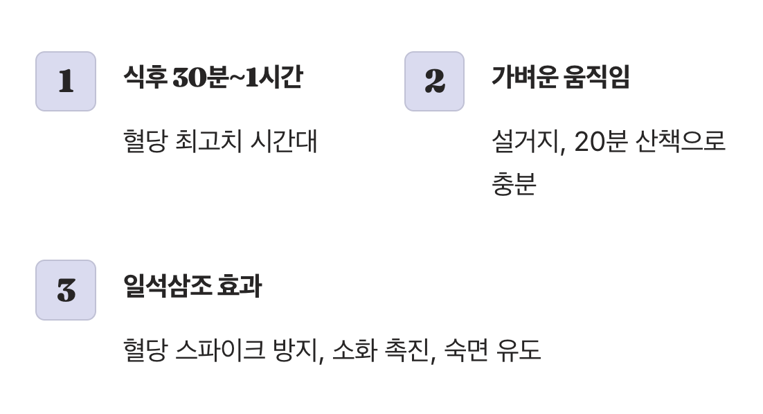 저녁을 배불리 먹고 소파에 누워 TV를 보는 것은 정말 달콤합니다. 하지만 그 순간 우리 핏속의 당분은 갈 곳을 잃고 뱃살로 차곡차곡 쌓이게 됩니다. 식사 후 30분에서 1시간 사이는 혈당이 가장 높게 치솟는 때입니다. 이때 가만히 있지 말고 몸을 움직여서 근육이 당분을 에너지로 쓰게 만들어야 합니다.