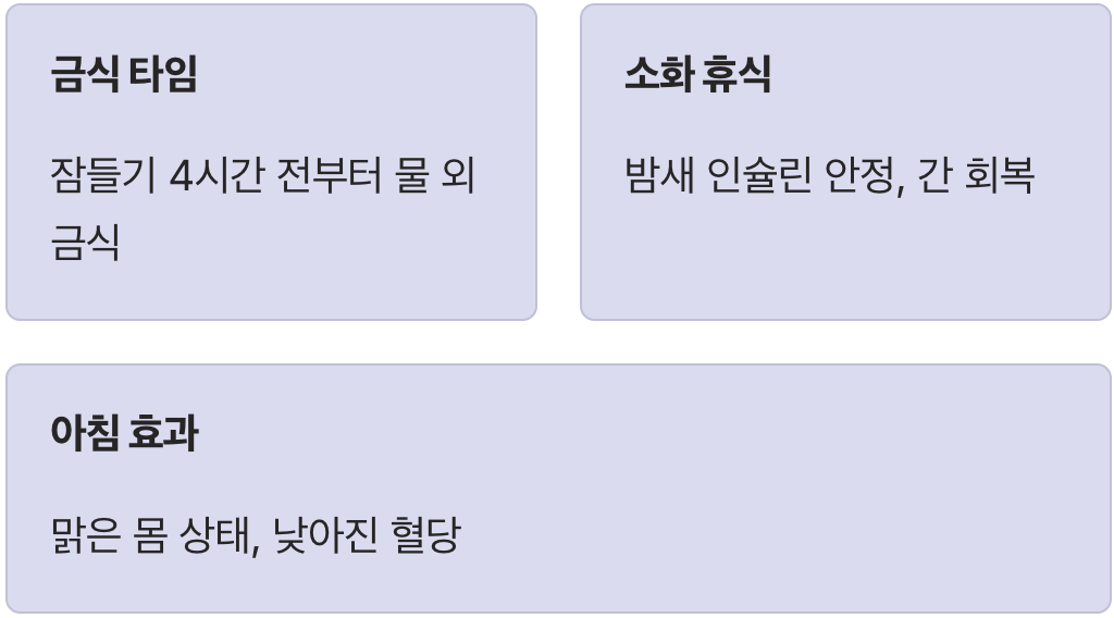 해결책은 아주 간단합니다. 잠자리에 들기 최소 4시간 전에는 물 외에 아무것도 먹지 않는 '금식 타임'을 갖는 것입니다. 만약 11시에 잠든다면 7시까지는 식사를 마쳐야 합니다. 이렇게 공복 상태를 길게 유지해 주면, 밤새 인슐린 수치가 안정을 찾고 간도 쉴 수 있어 다음 날 아침 맑고 가벼운 몸 상태와 함께 뚝 떨어진 수치를 선물 받게 될 것입니다.