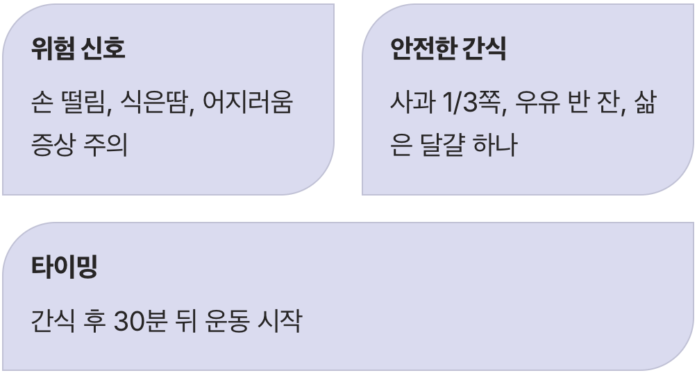 즉, 아침 식사를 가볍게 하고 나서 동네를 한 바퀴 걷거나 계단을 오르는 것이 공복에 뛰는 것보다 수치 조절에는 훨씬 효과적입니다. 만약 아침 시간이 너무 바빠서 꼭 식전에 해야 한다면, 앞서 말씀드린 대로 강도를 아주 약하게 조절하거나 간단한 요기를 하는 습관을 들이는 것이 가장 안전하고 확실한 관리 방법입니다.