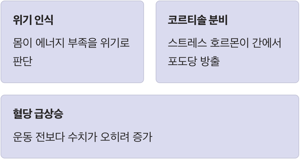 많은 분이 "아무것도 안 먹고 뛰었는데 왜 혈당이 오르죠?"라고 묻곤 합니다. 상식적으로는 에너지를 썼으니 내려가야 할 것 같지만 우리 몸은 생각보다 똑똑하고 복잡합니다. 빈속에 강한 운동을 하면 우리 몸은 이를 위기 상황으로 인식합니다. 에너지가 부족하다고 판단한 뇌가 간에 신호를 보내 저장해 두었던 포도당을 혈액 속으로 한꺼번에 쏟아내게 명령하기 때문입니다.