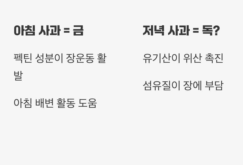 아침에 사과를 먹으면 소화·흡수와 배변에 도움을 주고, 저녁에 먹어도 위 건강에 문제가 없다면 큰 무리가 없다는 점을 안내합니다.