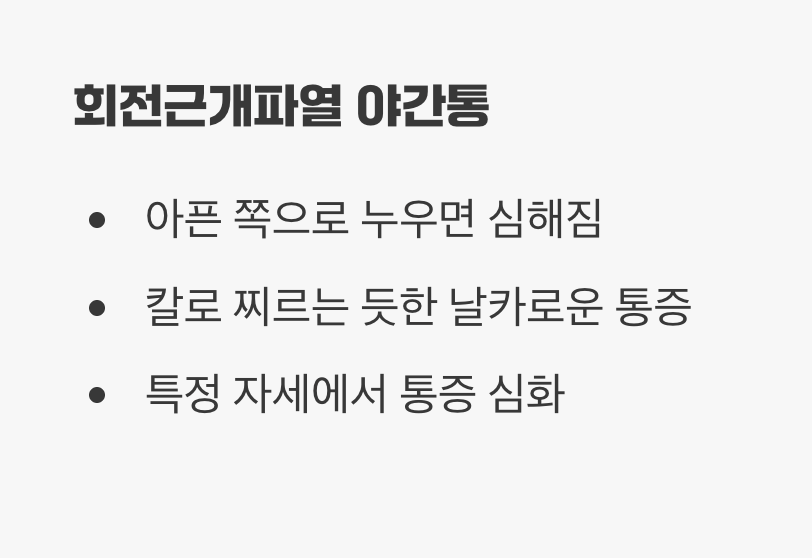 오십견과 회전근개파열 모두 밤에 통증이 심해지는 '야간통'을 동반할 수 있지만, 그 양상에는 미묘한 차이가 있습니다. 특히 회전근개파열은 아픈 쪽으로 돌아누웠을 때, 손상된 힘줄이 눌리면서 잠에서 깰 정도의 날카로운 통증을 유발하는 경우가 많습니다.