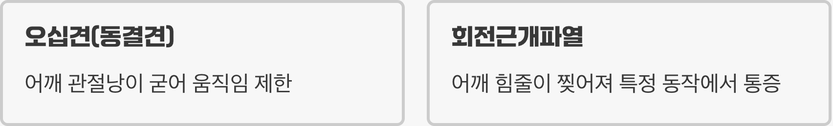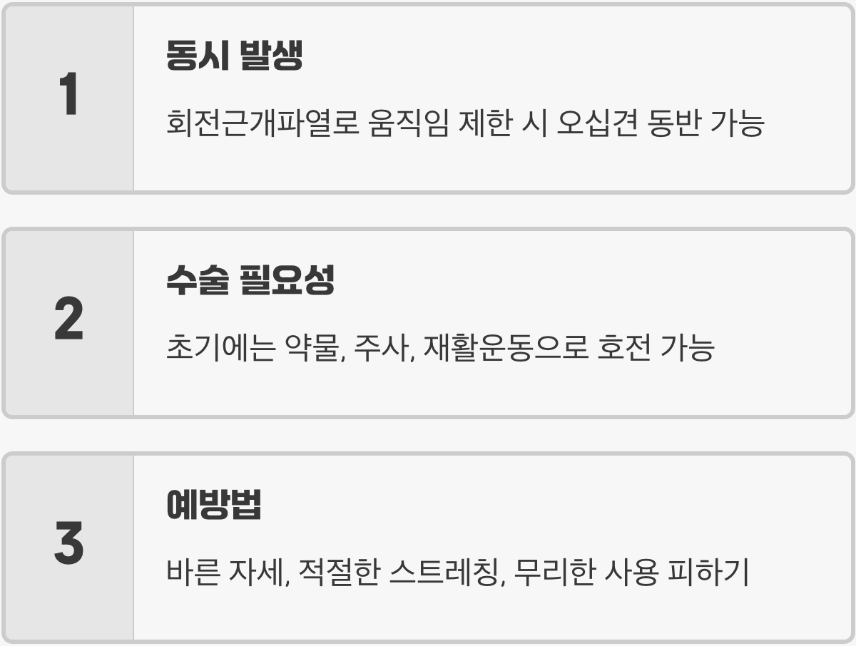 반면, '회전근개파열'은 어깨를 움직이게 하는 4개의 중요한 힘줄(회전근개) 중 하나 이상이 찢어지거나 손상된 상태를 말합니다. 이는 힘줄이 약해져 특정 동작에서 통증이 발생하고 힘을 쓰기 어려운 것이 특징입니다. 통증 때문에 스스로 팔을 들기는 어렵지만, 다른 사람의 도움을 받으면 대부분 끝까지 올릴 수 있다는 점에서 오십견과 결정적인 차이를 보입니다.