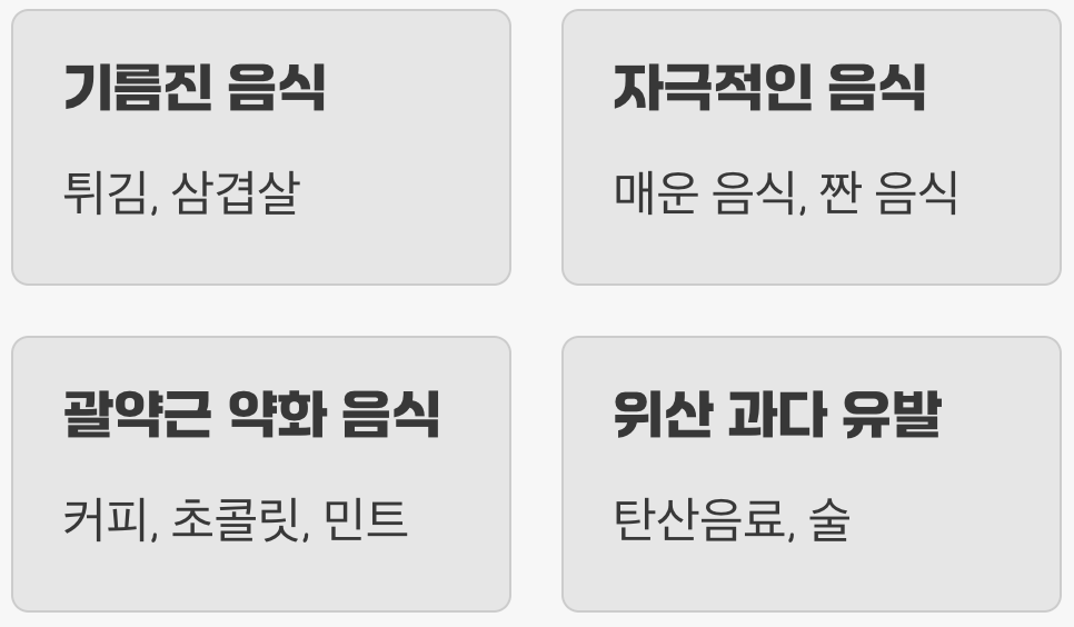 증상을 빠르게 악화시키는 음식들은 대부분 위산 분비를 촉진하거나, 괄약근 자체를 느슨하게 만드는 특징이 있습니다. 대표적으로 튀김, 삼겹살과 같이 기름진 음식은 위에 머무는 시간이 길어 위 내부 압력을 높이고, 결국 위산이 역류하기 쉬운 환경을 만듭니다. 맵고 짠 자극적인 음식 역시 식도 점막을 직접적으로 자극해 염증을 악화시키는 주범입니다.