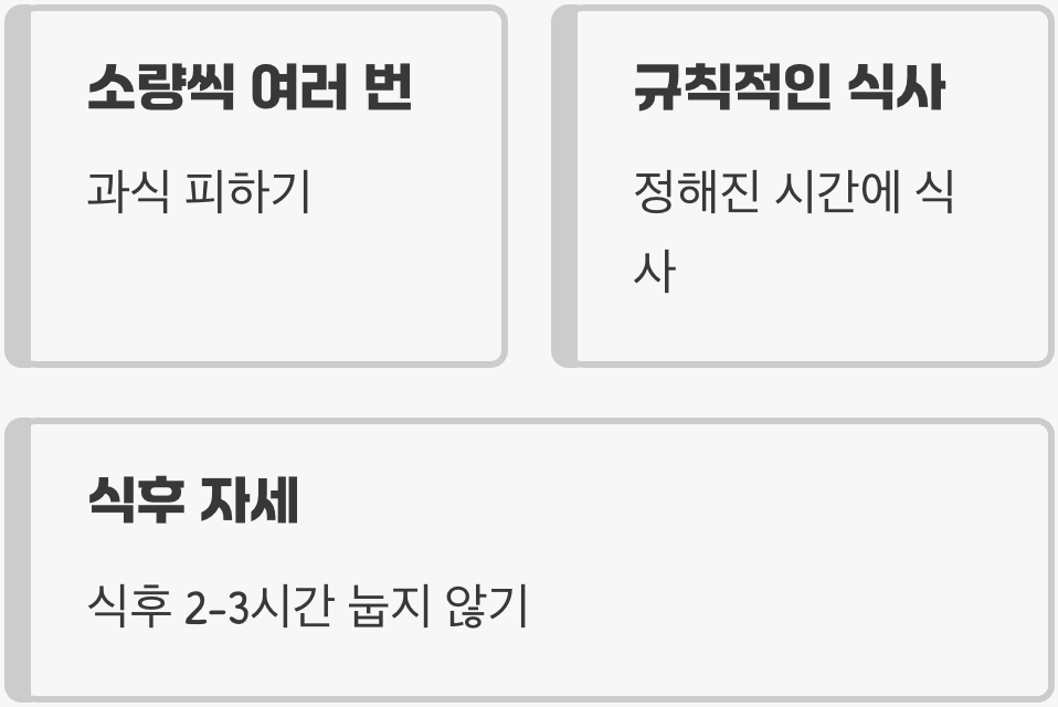 아무리 좋은 음식을 챙겨 먹어도 잘못된 식사 습관을 유지한다면 밑 빠진 독에 물 붓기나 다름없습니다. 한 번에 많은 양을 먹는 과식은 위를 늘어나게 하고 압력을 높여 역류를 유발하는 가장 나쁜 습관입니다. 규칙적인 시간에 맞춰 조금씩, 여러 번에 나누어 먹는 습관을 들이는 것이 중요합니다.