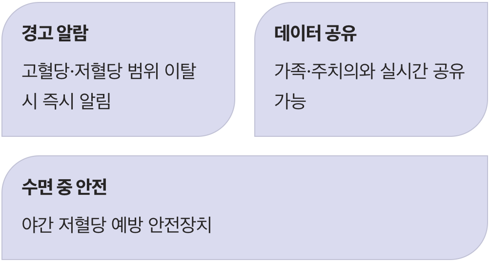 최신 연속혈당측정기들은 단순히 혈당 수치만 보여주는 것을 넘어, 똑똑한 ‘혈당 비서’의 역할까지 해냅니다. 그중 가장 중요한 기능은 바로 ‘고혈당 및 저혈당 경고 알람’ 기능입니다. 사용자가 설정한 범위를 벗어나면 스마트폰에서 경고음이 울려 위험한 상황을 미리 예방할 수 있게 도와줍니다. 특히 수면 중 저혈당을 놓치지 않게 해주는 아주 중요한 안전장치입니다.