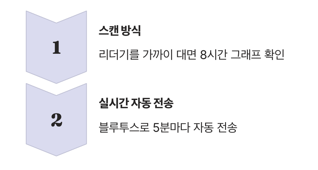 현재 시중에서 만날 수 있는 대표적인 연속혈당측정기는 크게 두 가지 방식으로 나뉩니다. 첫 번째는 ‘스캔 방식’입니다. 몸에 부착한 센서에 스마트폰이나 별도의 리더기를 가까이 가져다 대야(스캔해야) 그 순간의 혈당값과 지난 8시간의 그래프를 보여주는 방식입니다. 내가 원할 때 능동적으로 확인하는 개념이죠.