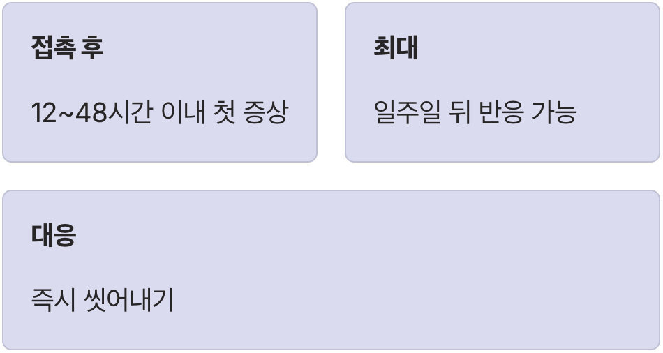 옻 접촉 후 며칠 이내 발진과 가려움이 시작되고, 증상은 옻과 접촉하지 않으면 서서히 호전됩니다.