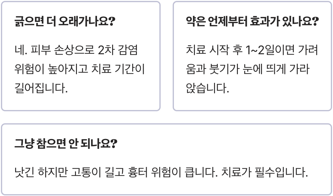 A. 우리 몸의 면역 체계가 결국에는 이겨내기 때문에 언젠가는 낫습니다. 하지만 그 과정이 훨씬 더 고통스럽고, 회복 기간도 길어지며, 심한 흉터나 색소 침착을 남길 가능성이 매우 큽니다. 적절한 치료는 단순히 증상을 완화하는 것을 넘어, 후유증을 최소화하는 가장 중요한 과정입니다.
