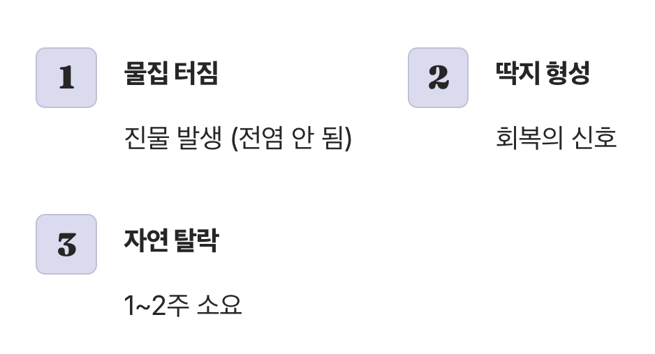 이 회복기는 보통 1주에서 2주 정도 소요됩니다. 이때 가렵다고 딱지를 억지로 떼어내면, 회복이 더딜 뿐만 아니라 흉터나 색소 침착을 남길 수 있습니다. 자연스럽게 떨어질 때까지 인내심을 갖고 기다리며, 건조해지지 않도록 보습에 신경 써주는 것이 흉터 없이 깨끗하게 낫는 가장 좋은 방법입니다.