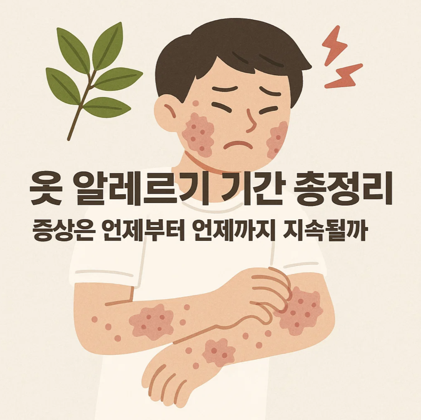 옻 알레르기 증상은 보통 노출 후 4시간에서 4일 사이에 시작되며, 피부염은 1~3주 정도 지속됩니다. - 옻이 올랐어요, 옻 알레르기 치료_피부과전문의 닥터Y - 네이버 블로그