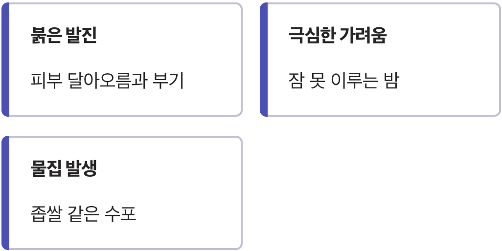 A. 약을 먹고 바른다고 해서 즉시 가려움이 사라지는 것은 아닙니다. 보통 치료를 시작하고 1~2일 정도 지나면 극심했던 가려움과 붓기가 눈에 띄게 가라앉기 시작하며, 훨씬 편안함을 느끼실 수 있습니다.