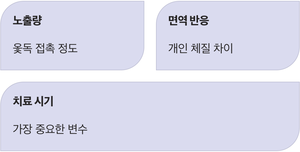 그렇다면 왜 사람마다 회복까지 걸리는 시간이 다를까요? 여기에는 크게 세 가지 변수가 작용합니다. 첫째는 ‘얼마나 많은 옻독에 노출되었는가’이고, 둘째는 ‘개인의 면역 체계가 얼마나 민감한가’입니다. 그리고 마지막으로 가장 중요한 세 번째는 ‘얼마나 빨리, 그리고 적절하게 치료를 시작했는가’입니다.