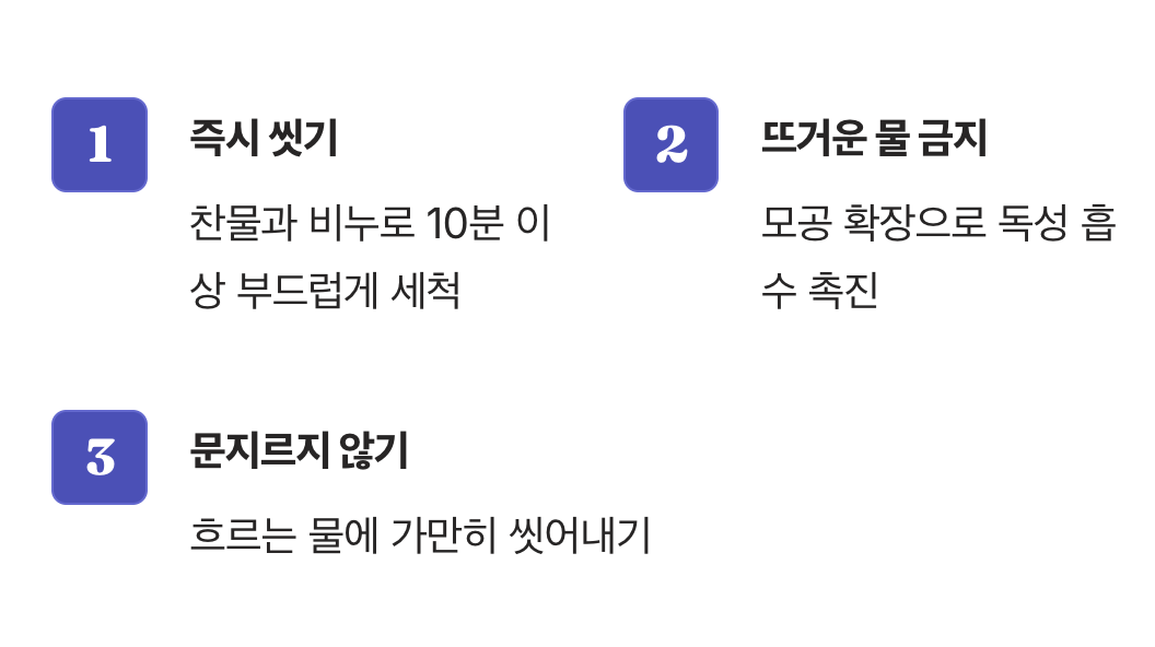 옻독과의 싸움은 그야말로 시간과의 전쟁입니다. 옻나무의 ‘우루시올’ 성분이 우리 피부에 스며들기 전에 얼마나 빨리 씻어내느냐에 따라 앞으로 겪게 될 고통의 크기가 결정됩니다. 만약 옻에 닿았다고 의심되는 순간이라면, 주저하지 말고 즉시 행동에 옮겨야 합니다.